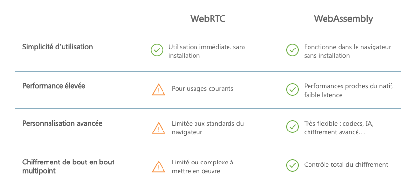WebAssembly apporte des performances et une sécurité renforcée, avec une personnalisation plus poussée, qui nécessite dans le même temps un support technique et navigateur plus avancé. Il permet d’implémenter des algorithmes de chiffrement avancés et personnalisés directement dans le navigateur, avec des performances proches du natif, quel que soit le nombre de participants.