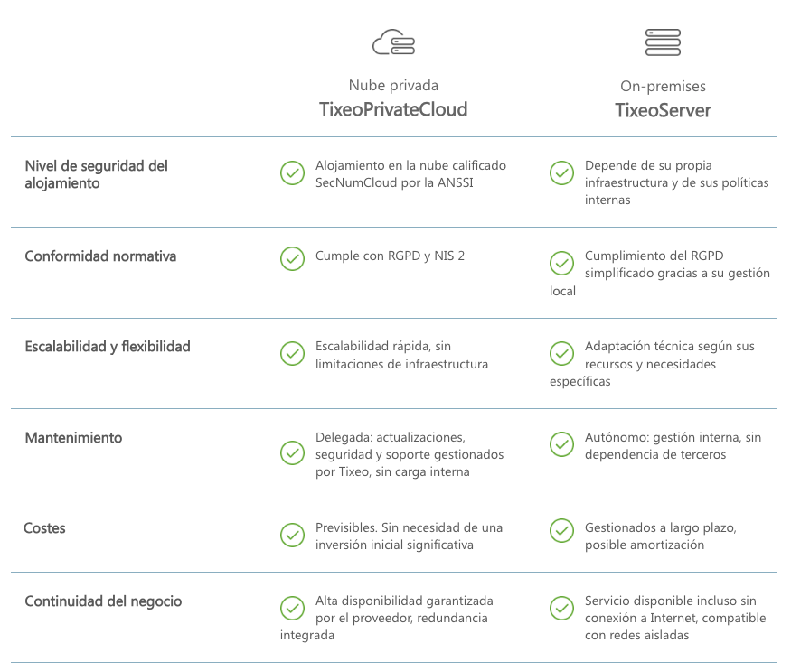Con Tixeo, ambas opciones le ofrecen el mismo beneficio: la seguridad de sus datos, ya sea que estén alojados en un cloud europeo certificado SecNumCloud o en sus propios servidores.